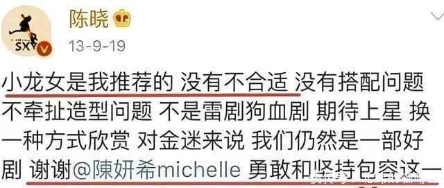 电视剧播出前,全网都在吐槽陈妍希不适合演“小龙女”。 在剧中饰演“杨过”的陈晓发文:“这个觉得是我推荐的,没有造型问题,也无关搭配的问题。” 大概从那个时候起,两人相爱的伏笔就已经埋下。